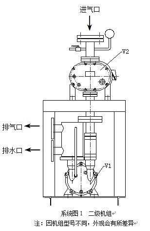 該真空機組的主泵為V2型羅茨真空泵,由V1型液環(huán)真空泵作為前級泵(如系統(tǒng)圖1),為保證各泵的正常運轉(zhuǎn),應(yīng)按以下程序操作: